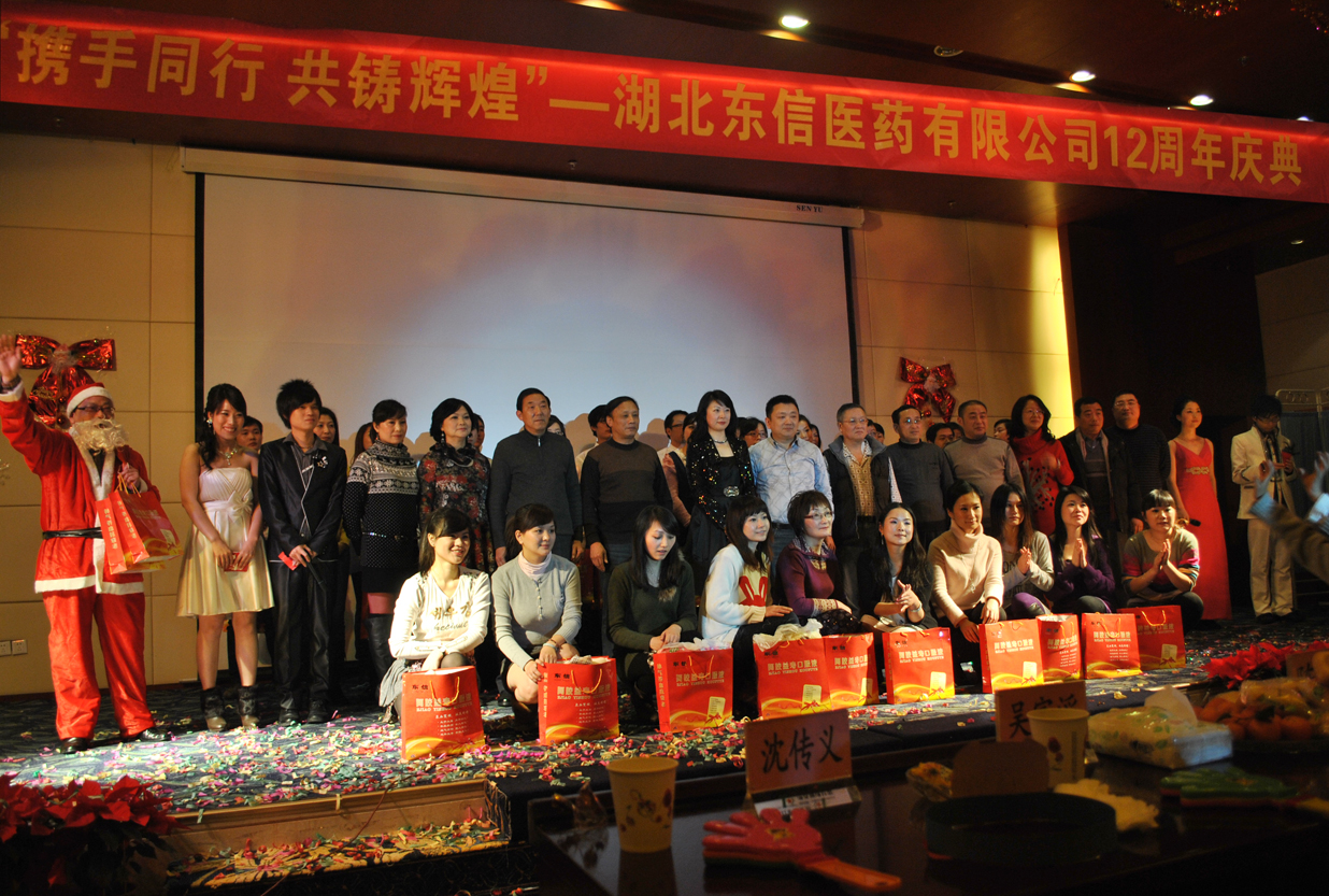 攜手同行,共鑄輝煌。踏著2010年冬天的第一場(chǎng)雪,湖北東信醫(yī)藥有限公司迎來了12周年華誕。12月24日,湖北東信醫(yī)藥有限公司12周年慶典在武漢市通院賓館隆重舉行。東信醫(yī)藥集團(tuán)、湖北東信藥業(yè)有限公司、湖北東信惠濟(jì)堂藥業(yè)有限公司、武漢東信醫(yī)藥科技有限責(zé)任公司、湖北東信醫(yī)藥有限公司的主要領(lǐng)導(dǎo)以及各部門的干部職工近兩百人出席了慶典活動(dòng)。