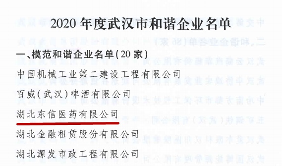 近日,武漢市人民政府辦公廳發(fā)布“2020年度武漢市和諧企業(yè)”名單,湖北東信醫(yī)藥有限公司等二十家企業(yè)被評(píng)名為“2020年度武漢市模范和諧企業(yè)”。