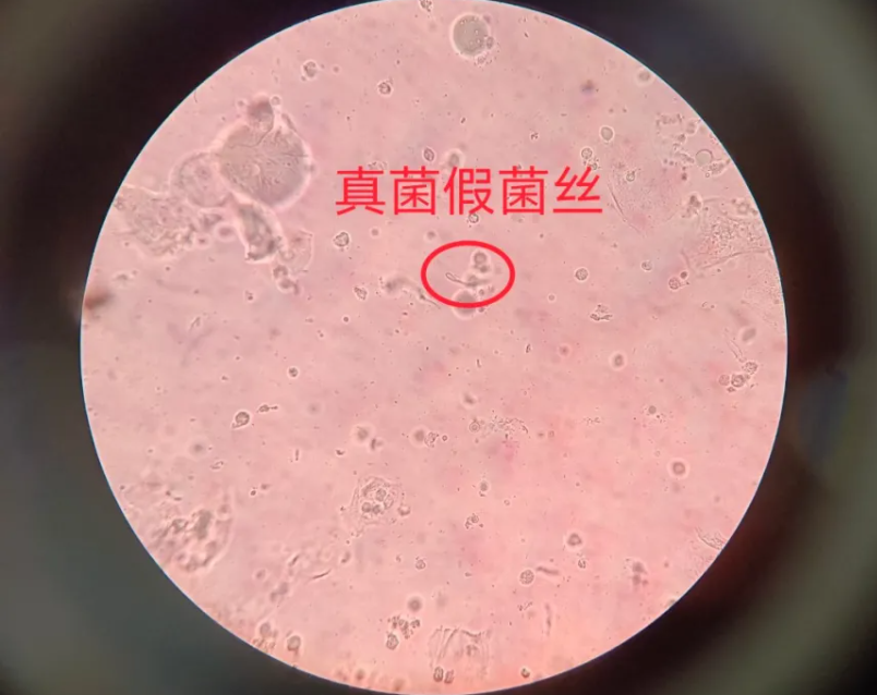 另外,在另一個視野中看到了真菌的假菌絲,見下圖紅色圓圈,說明真菌生長繁殖有些旺盛,且患者感染真菌時間較長;滴蟲為近期感染所致。然而,從pH值角度來看,滴蟲和真菌的pH值互相沖突。醫(yī)生認為,該患者可能是早些時候已經感染了真菌,真菌經過一段時間的生長繁殖,長出了假菌絲,近期感染了滴蟲,滴蟲阻礙了乳酸桿菌的酵解,使乳酸生成減少,進而使陰道PH值轉變?yōu)橹行曰驂A性,而真菌又不怕中性或堿性環(huán)境,故而出現(xiàn)滴蟲合并真菌感染的情況。
