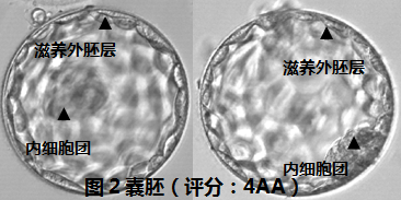 正常發(fā)育的胚胎會(huì)在第5或第6天形成囊胚;囊胚由內(nèi)細(xì)胞團(tuán)及滋養(yǎng)外胚層兩群細(xì)胞構(gòu)成,通常用于移植的囊胚至少一群細(xì)胞的評(píng)分≥B級(jí)(細(xì)胞數(shù)量較多),見圖2。兩群細(xì)胞數(shù)量均很少的評(píng)分均為C級(jí)的囊胚因其成功妊娠幾率小,在有其他胚胎可供選擇時(shí)通常選擇廢棄,見圖3。