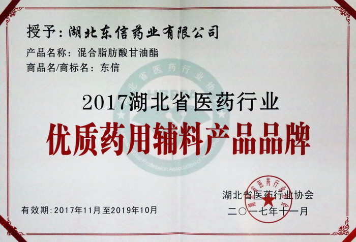 近日,湖北東信藥業(yè)有限公司在湖北省第三屆楚商大會醫(yī)藥大健康產(chǎn)業(yè)高峰論壇上被授予“2017湖北省醫(yī)藥行業(yè)先進(jìn)成長型企業(yè)”,產(chǎn)品——“混合脂肪酸甘油酯”被評為“2017湖北省醫(yī)藥行業(yè)優(yōu)質(zhì)藥用輔料產(chǎn)品品牌”。