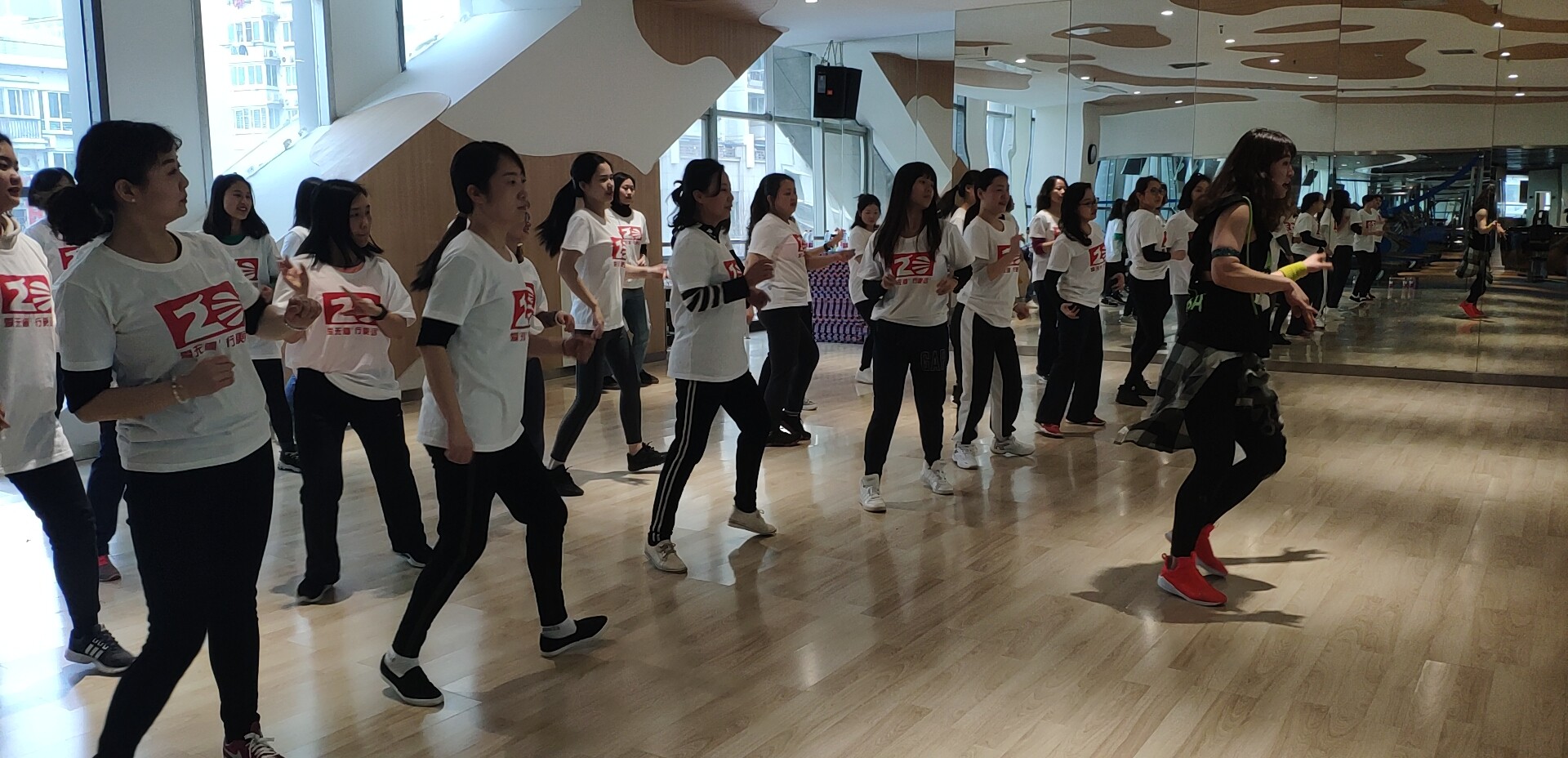 跳尊巴舞的女神們在老師的帶領下,放松身體感受音樂。動感的音樂,活力的舞姿,讓我們看到了東信女神們自信的魅力。